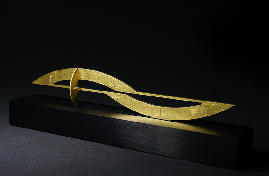 Premier choc, cette horloge portait le nom d’Around Five! J’y vis naturellement un signe. Du coup, l’espace temps de Marie de l’Isle offrait à cette horloge une dimension existentielle. A 6 heures précises du matin cette sculpture du temps offre immuablement sa plus féerique animation: tout à droite, lorsque la ‘voile’ perpendiculaire servant d’indicateur horaire atteint la graduation du dernier 6, elle effectue en 20 secondes une course rétrograde qui la ramène à son point de départ, le 6 à l’opposé. Ce 6 matinal entame la comptabilité des heures du nouveau jour, avec une montée en arc de cercle qui atteint son apogée à 12:00 pour se mettre à redescendre jusqu’à 18h00, soit un point de jonction qui coïncide avec le milieu absolu d’un signe d’infini couché à l’horizontale. Ce symbole de perfection et d’éternel recommencement, en forme de 8 stylisé, les concepteurs l’ont sciemment aligné à une ligne d’horizon. Émouvant.