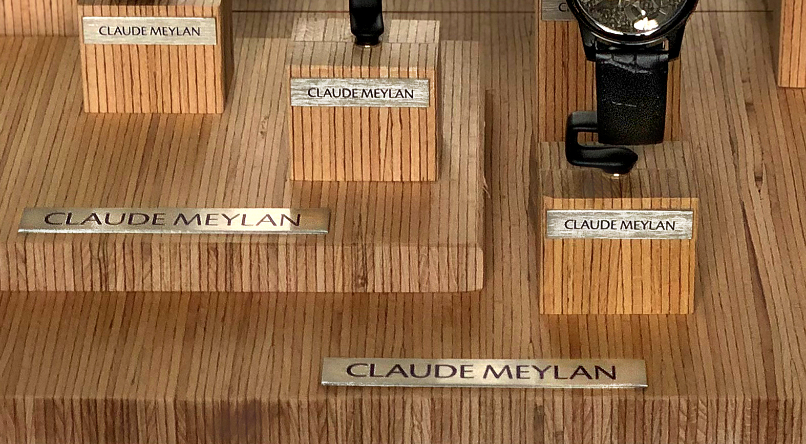 A new 100% recyclable display, made of wood with the specialized workshop Eric Dakkus. A space where watches, such as the latest Collection 66 or Sheherazade, two Lionesses tamed by master watchmakers, can lurk or stand… On a background of beech tree nervures from the Vallée de Joux, which serve as a frame for this cage open to the world. It is a noble receptacle made of blocks and trays from wooden slats assembled ecologically. For treasures in the showcase… Official Claude Meylan website.