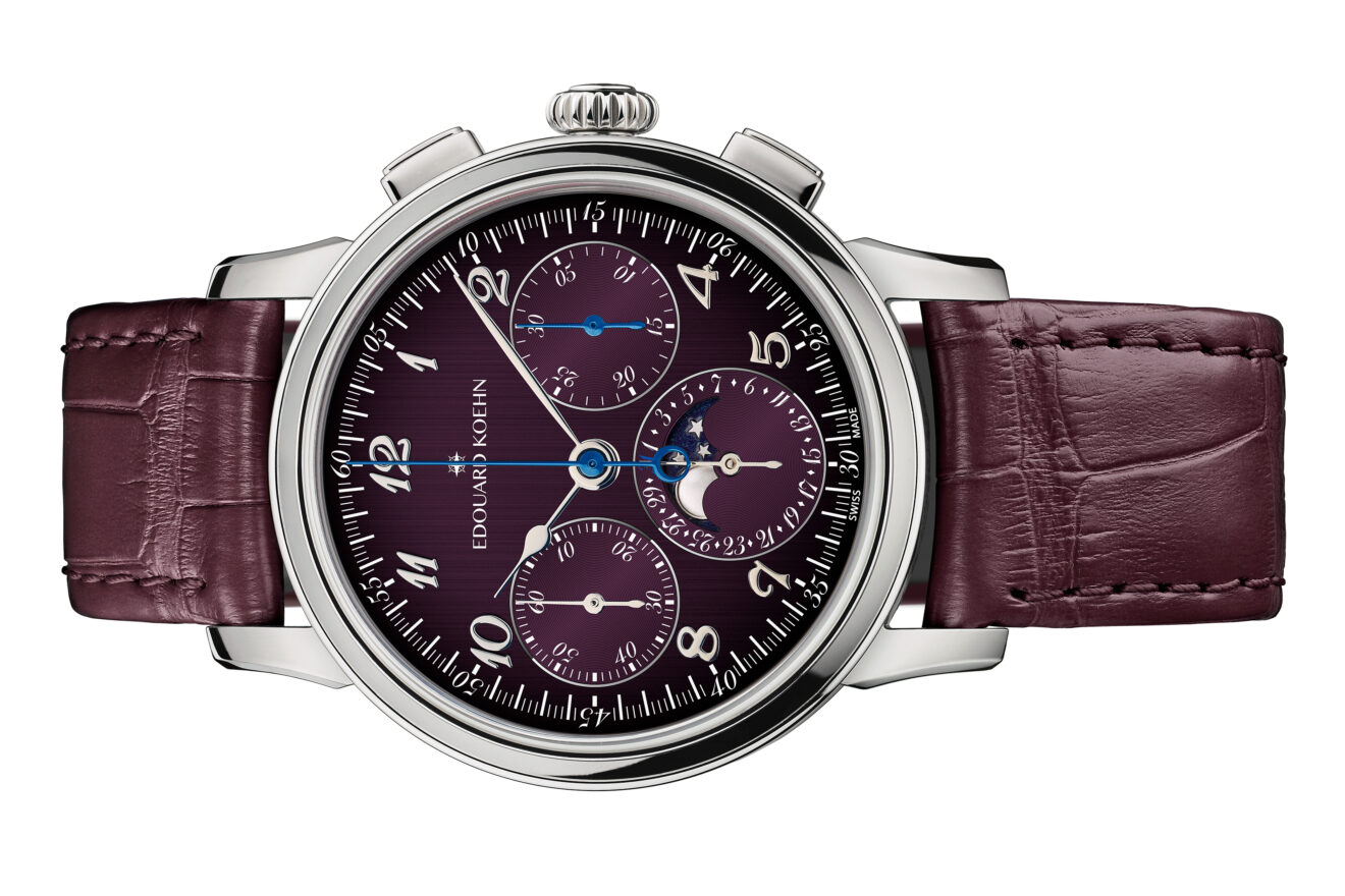 Housed in a 40mm stainless steel case water-resistant to 50 meters, the Legacy Moonphase Chronograph features applied Breguet numerals, leaf-shaped hands, and a vertical satin-finished gradient purple dial that bridges classical elegance with modern refinement. Each of the ten individually numbered pieces stands as a rare expression of Edouard Koehn’s horological expertise and enduring legacy.